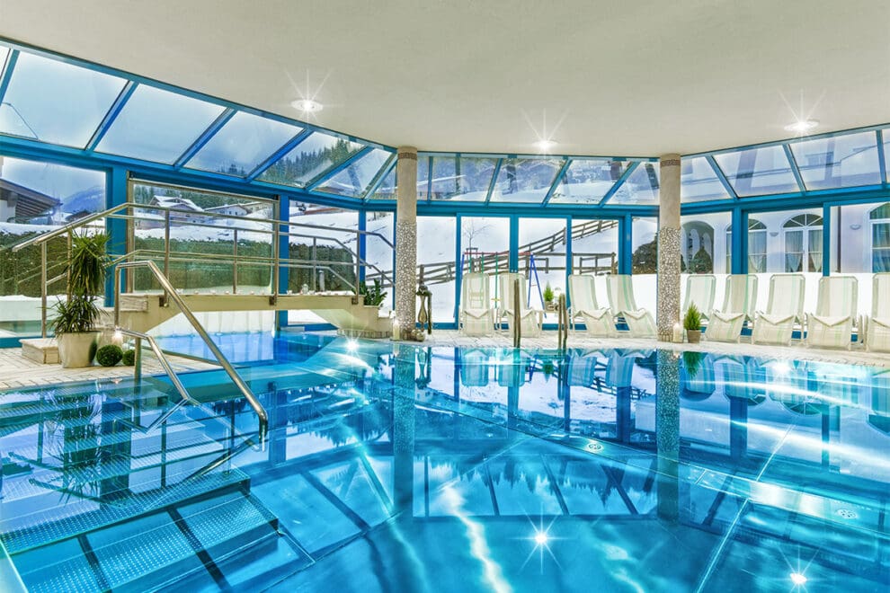 • Panoramahallenbad mit beheiztem Außenpool, Jet-Stream-Massagedüsen, Whirlpoolsitzbank im Freibecken